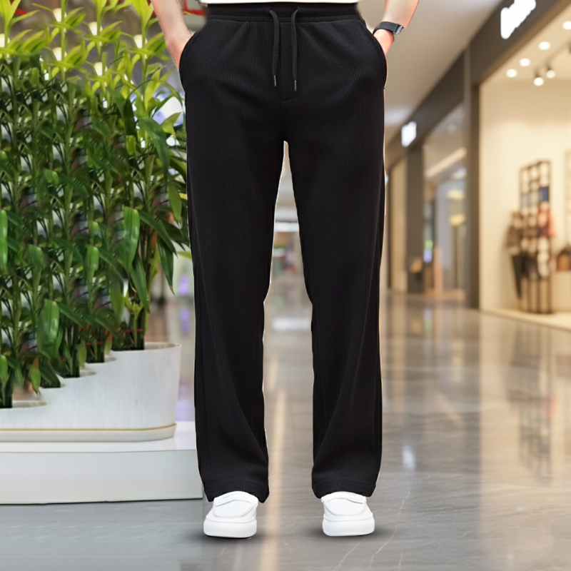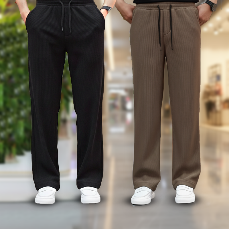 Soft, stretchable 2/2 rib fabric trouser designed with a relaxed straight-fit cut for maximum comfort and style. Features an elastic waistband with drawstring, smooth fall, and side pockets—ideal for casual wear, gym, travel, or daily use.