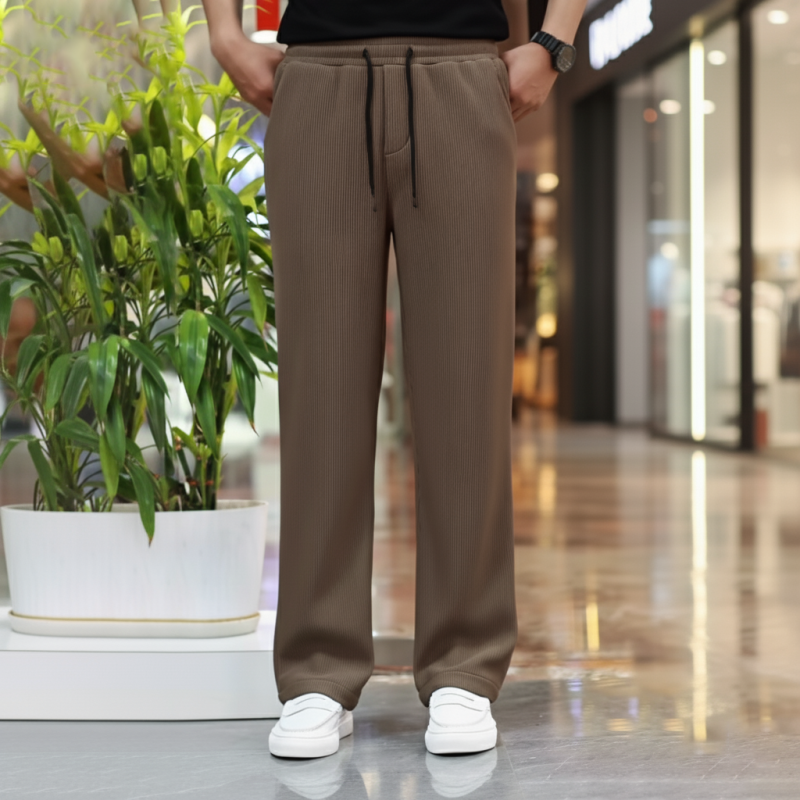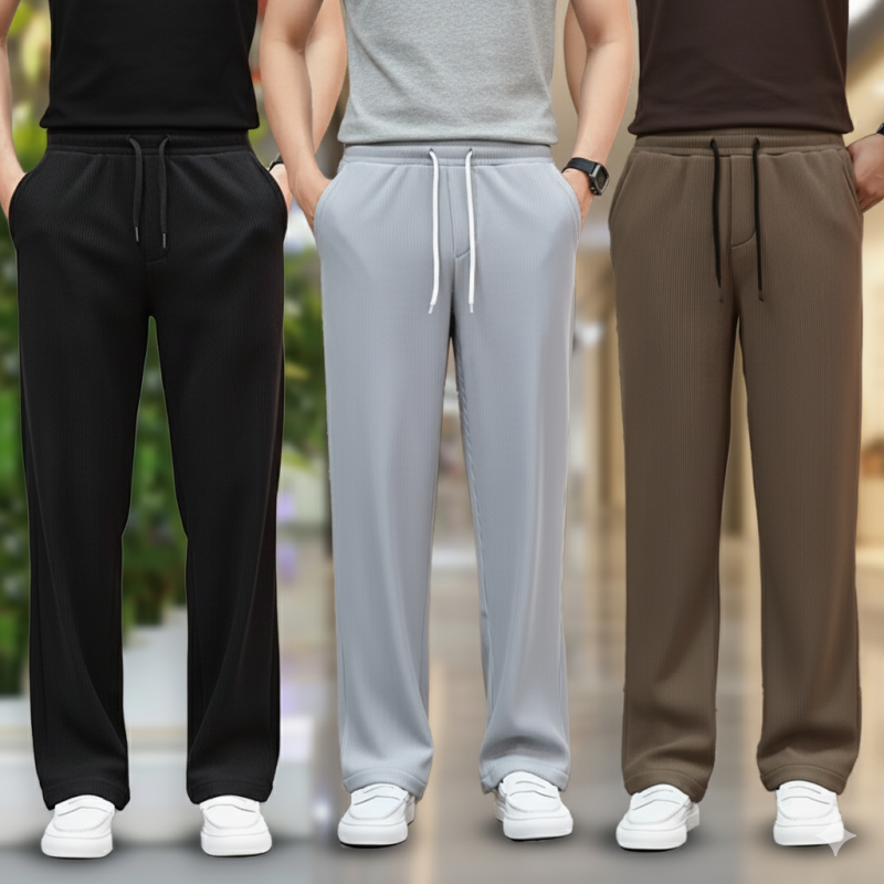 Soft, stretchable 2/2 rib fabric trouser designed with a relaxed straight-fit cut for maximum comfort and style. Features an elastic waistband with drawstring, smooth fall, and side pockets—ideal for casual wear, gym, travel, or daily use.